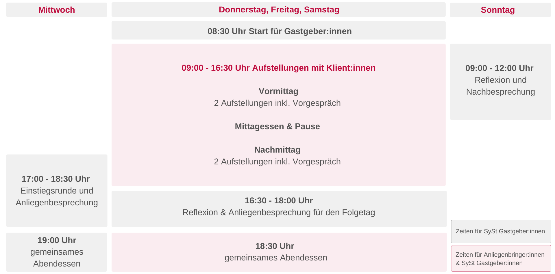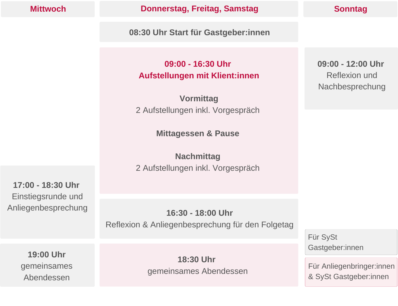 • Die Anliegenbringer:innen werden jeweils an einem der vier Tage eingeladen. Sowohl das Vorgespräch als auch die Aufstellung selbst finden in Anwesenheit der gesamten Gruppe statt. Anliegenbringer:innen sind den ganzen Tag dabei und erleben so auch das lösungsfokussierte Feedback und Aufstellungen anderer.